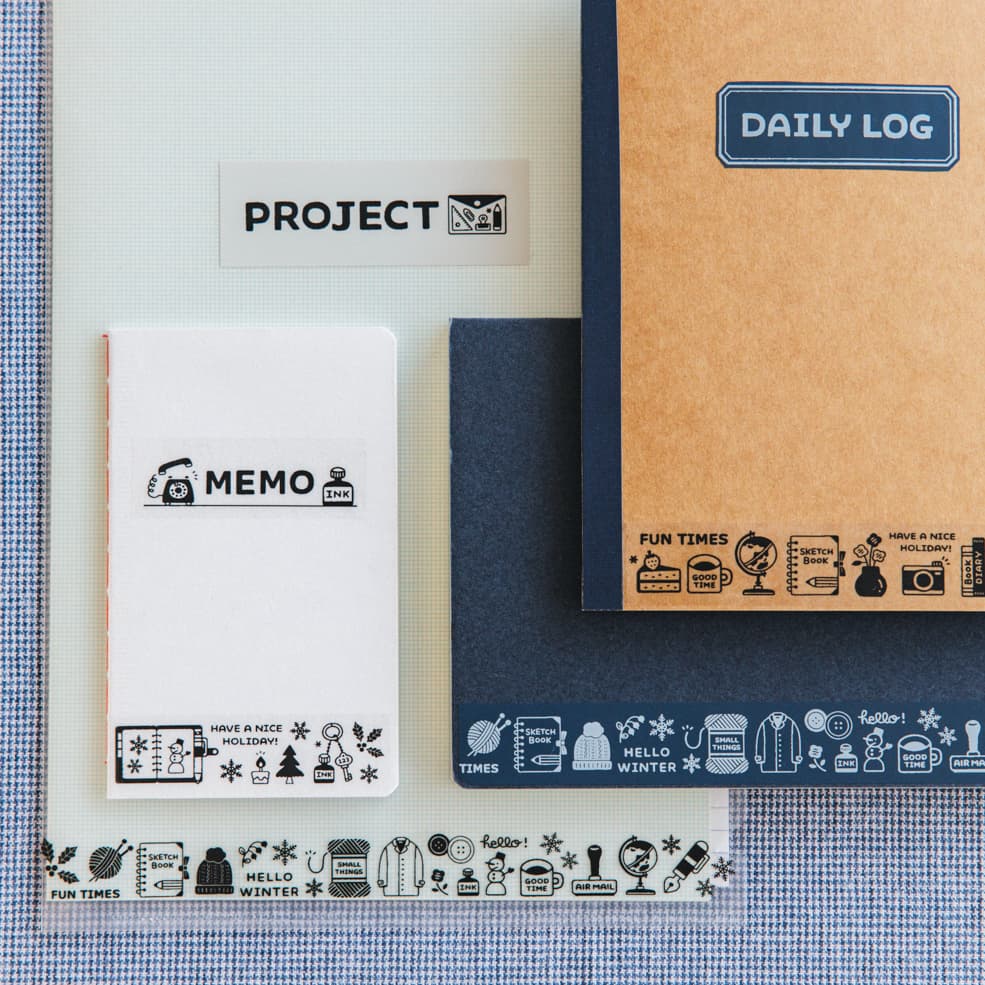 アルファベット絵文字を使ったラベルは、ノートやメモ帳の表紙に貼ると印象的なタイトルラベルに。